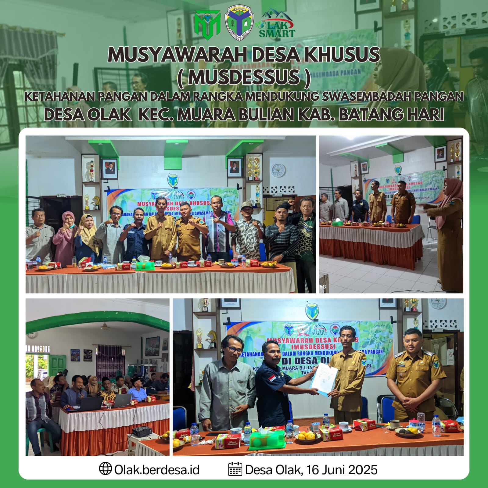 Musyawarah Desa Khusus (Musdessus) Ketahanan Pangan Desa Olak Kec. Muara Bulian yang dihadiri oleh BPD beserta anggota, Kepala Desa Olak beserta perangkat dan staf, Bapak Camata Muara Bulian, TA, P.......