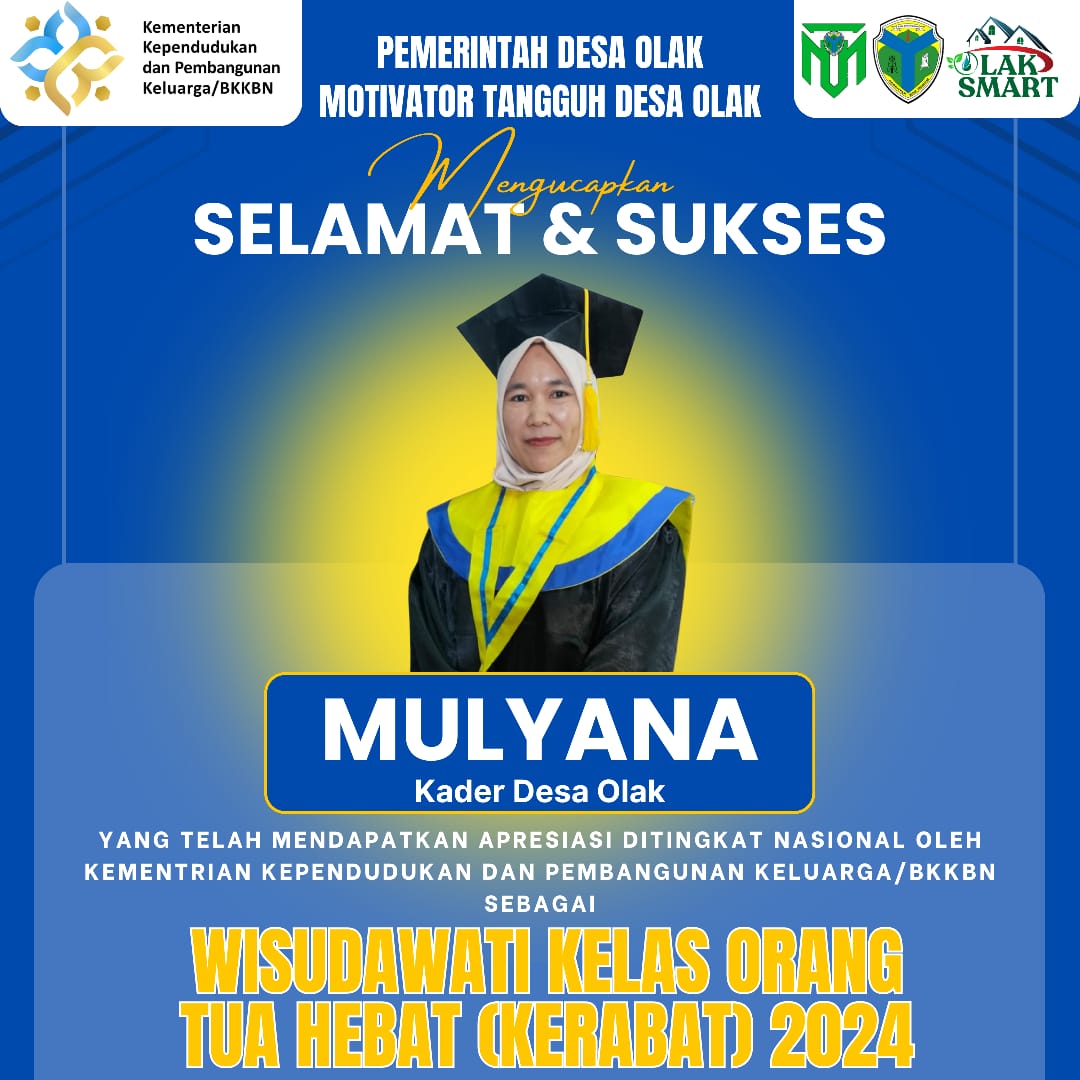 Kader Desa Olak A.n MULYANA yang telah mendapatkan Apresiasi ditingkat Nasional oleh Kementrian Kependudukan dan Pembangunan Keluarga / BKKBN sebagai Wisudawati Kelas Orang Tua Hebat (KERABAT) tahu.......
