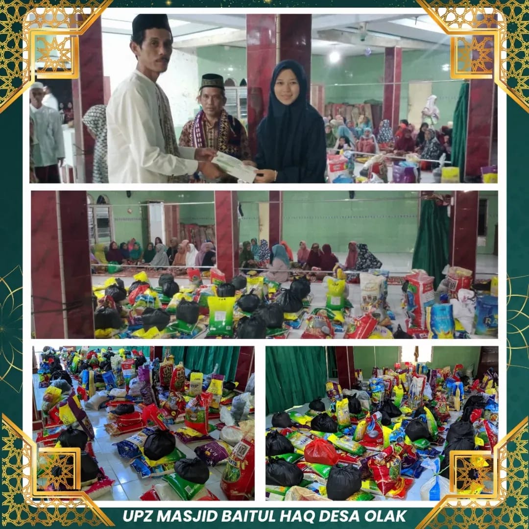 Penyerahan Zakat Fitrah dan Zakat Mall dilaksanakan di Masjid Baitul Haq Desa Olak serta disalurkan kepada Para Mustahiq Zakat.